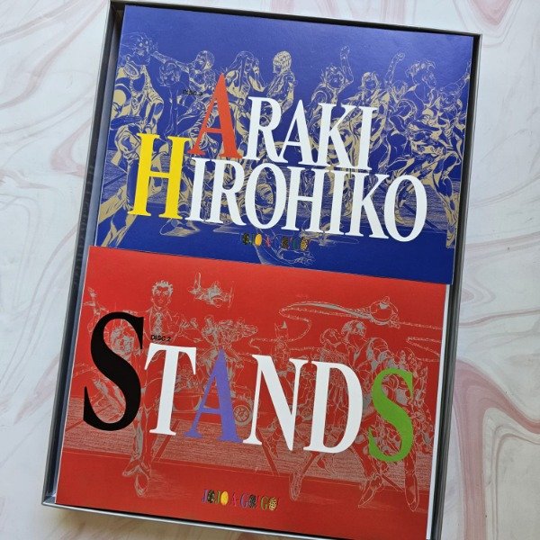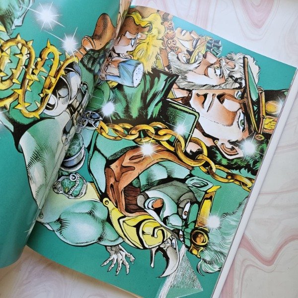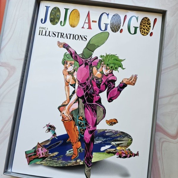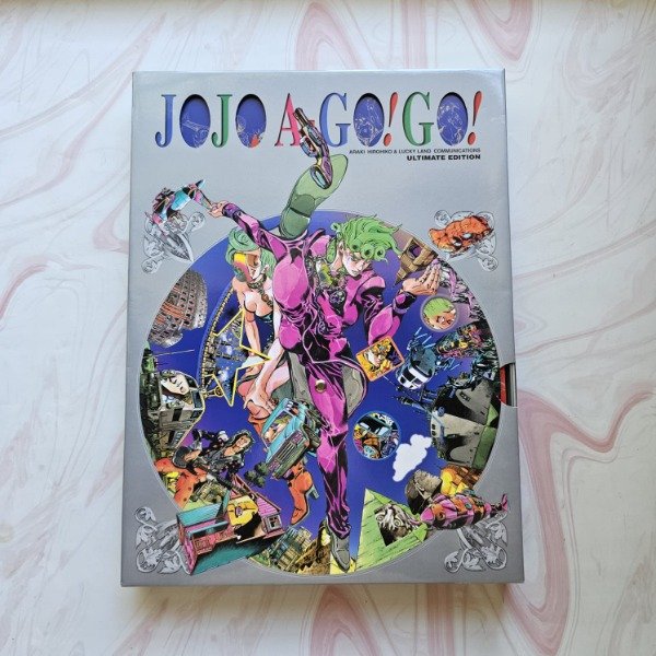 JOJO A-GO!GO! es un art book ilustrado y escrito por Hirohiko Araki y Lucky Land Communications en conmemoración del final de la parte 5 Golden Wind en el año 2000. Abarca la serie de JoJo’s Bizarre Adventure particularmente desde Stardust Crusaders hasta Golden Wind.