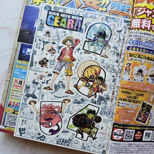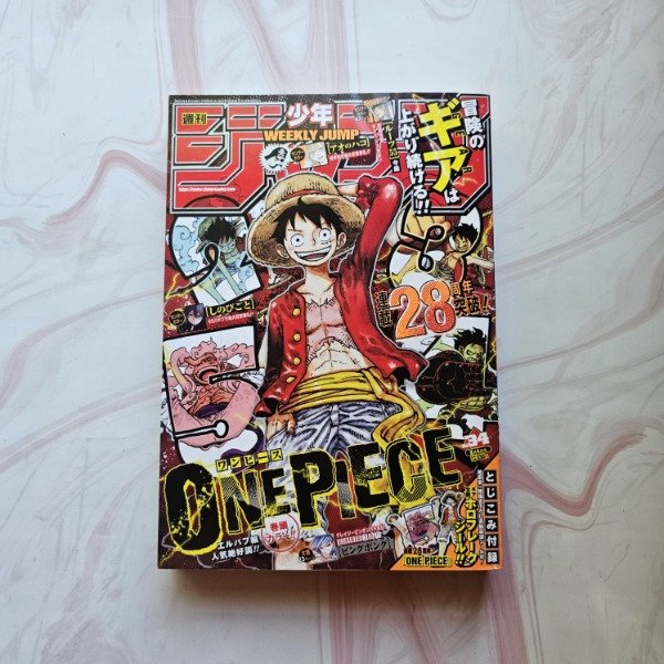 Revista Weekly Shonen Jump 2025 No.34 (22 de julio, 2025) con portada de One Piece de Eiichiro Oda con motivo del aniversario número 28 del manga
